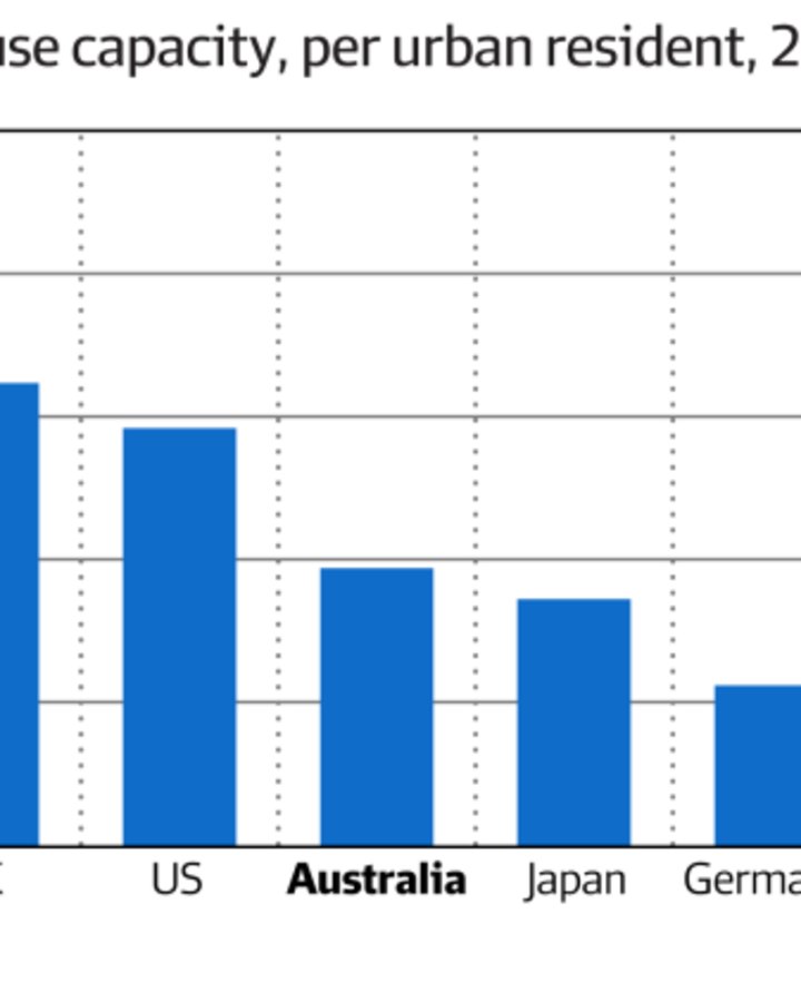 To reach 0.6 cubic metres per person by 2028 and support the needs of another 1.9 million people who will come to Australia over the next four years, another 400,000 square metres of warehouses is needed, CBRE says. These facilities would need to have an average height of 11.5 metres to hold enough storage pallets to achieve the 0.4 cubic metres per person target.