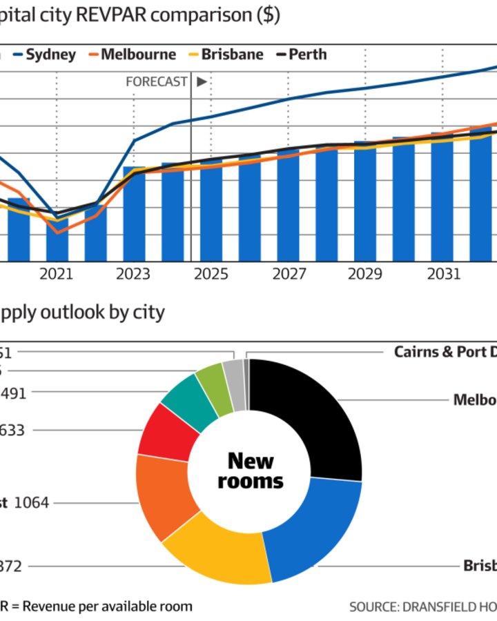 In Melbourne, which has absorbed more new hotel stock than other markets, Dransfield said there were several years in its recovery arc before occupancy levels reach 80 per cent and rates can start climbing. Brisbane is expected to reach an 82 per cent occupancy rate by 2033, according to Dransfield.